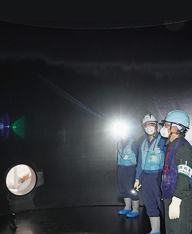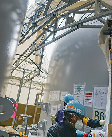 - 私たちはALPS処理水等を貯留するタンクの点検・保全を担当しています。タンクの状態を確実に把握し、長期的に安全に使い続けられるようメンテナンスすることが役割です。年次点検では、外面よりタンク側面の塗装の剥がれや、サビの目視点検、超音波による肉厚測定などの点検を行います。10年に一度の本格点検では、水抜きを行ったタンクは点検と同時に内面の塗装をやり直すことで、今後もタンクを安全に継続使用できるようにメンテナンスをしています。