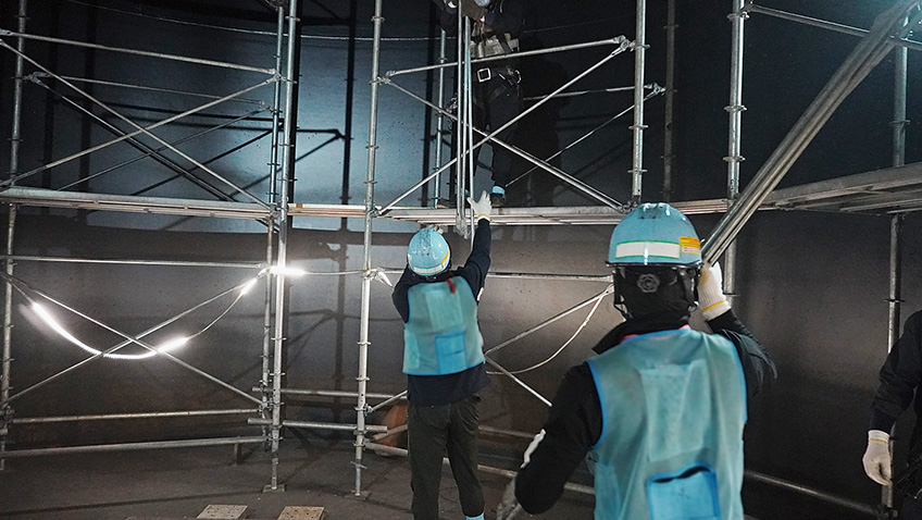 - 使用する足場材料の低減を目的として、解体した足場材を次のタンクへ運び入れて、足場の組み立てを解体と同時進行で始めます。