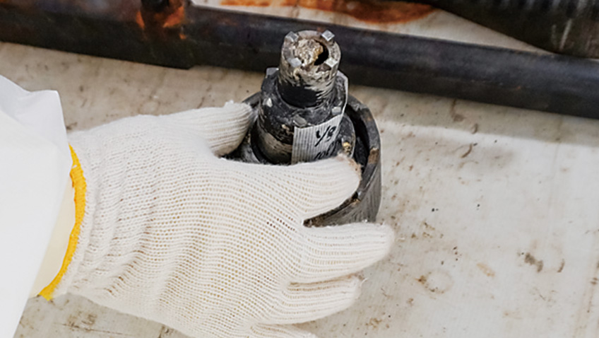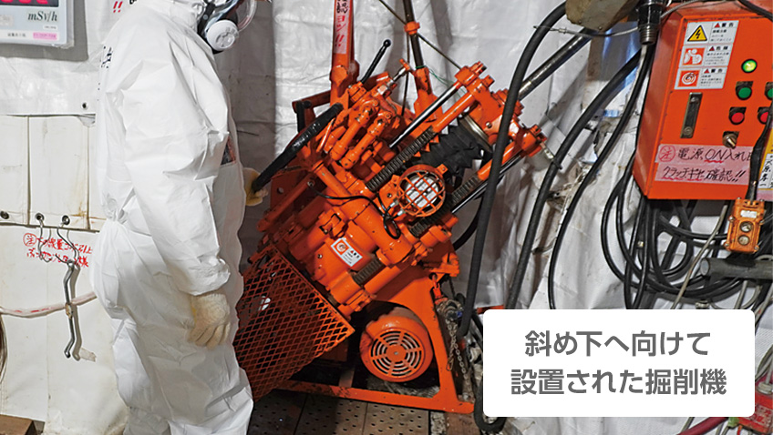 削孔は1か所あたり30~40m掘り進めるにあたり、100分の1程度の施工精度が必要で、最終到達点で30cmほどのずれに抑えなければ配管などに干渉してしまいます。さらに、コンクリートのような硬い部分と、発泡ポリエチレンのような柔らかい材料が混在しているため、先端部の削孔ビットは柔らかい方向に流れやすくなります。常にズレの方向を確認しながらの作業が必要で、熟練した技術が求められます。また、汚染水の発生を減らすことが目的なので、水を使った冷却ができず先端のビット部材の摩耗も激しく、これまでに施工精度が確保できるようビットの開発を行いながら、工事を進めてきました。施工期間は1か所あたり1~2か月、難しい場所によっては3か月以上かかることもあります。まず1m掘進して精度を確認し、次ステップは数mでも問題ないかを確認しながら進むという工程を、施工会社と相談しながら慎重に進めています。